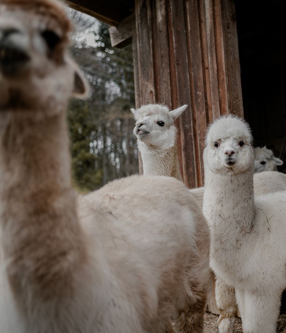 Alpakas haben große Augen, eine sanfte Ausstrahlung und diesen ganz besonderen Blick, der sagt: Atme mal durch – alles halb so wild. Sie urteilen nicht. Sie drängeln nicht. Sie sind einfach da. Und genau das macht die Zeit mit ihnen – kombiniert mit einer Auszeit in der Cabin – so besonders.