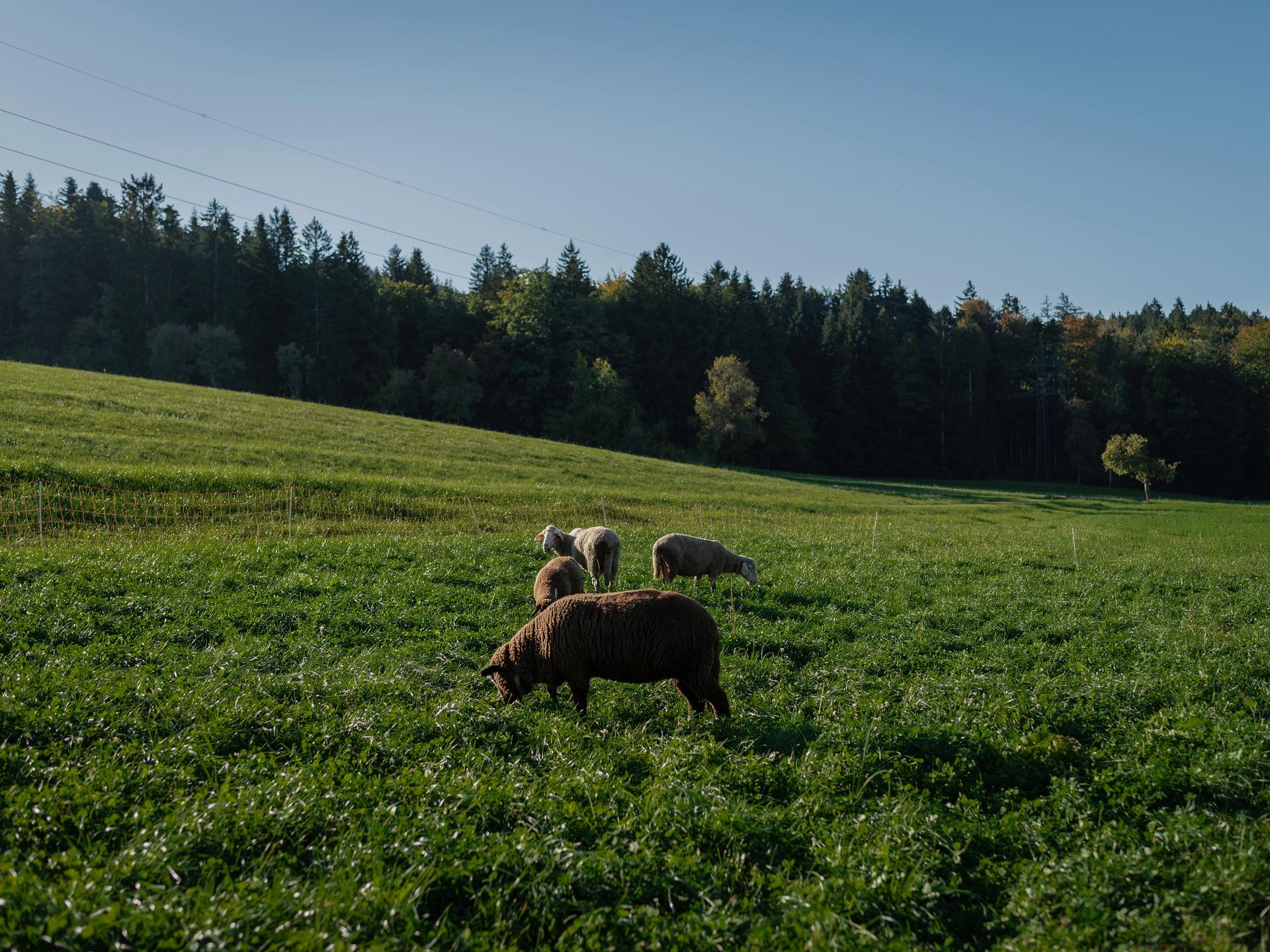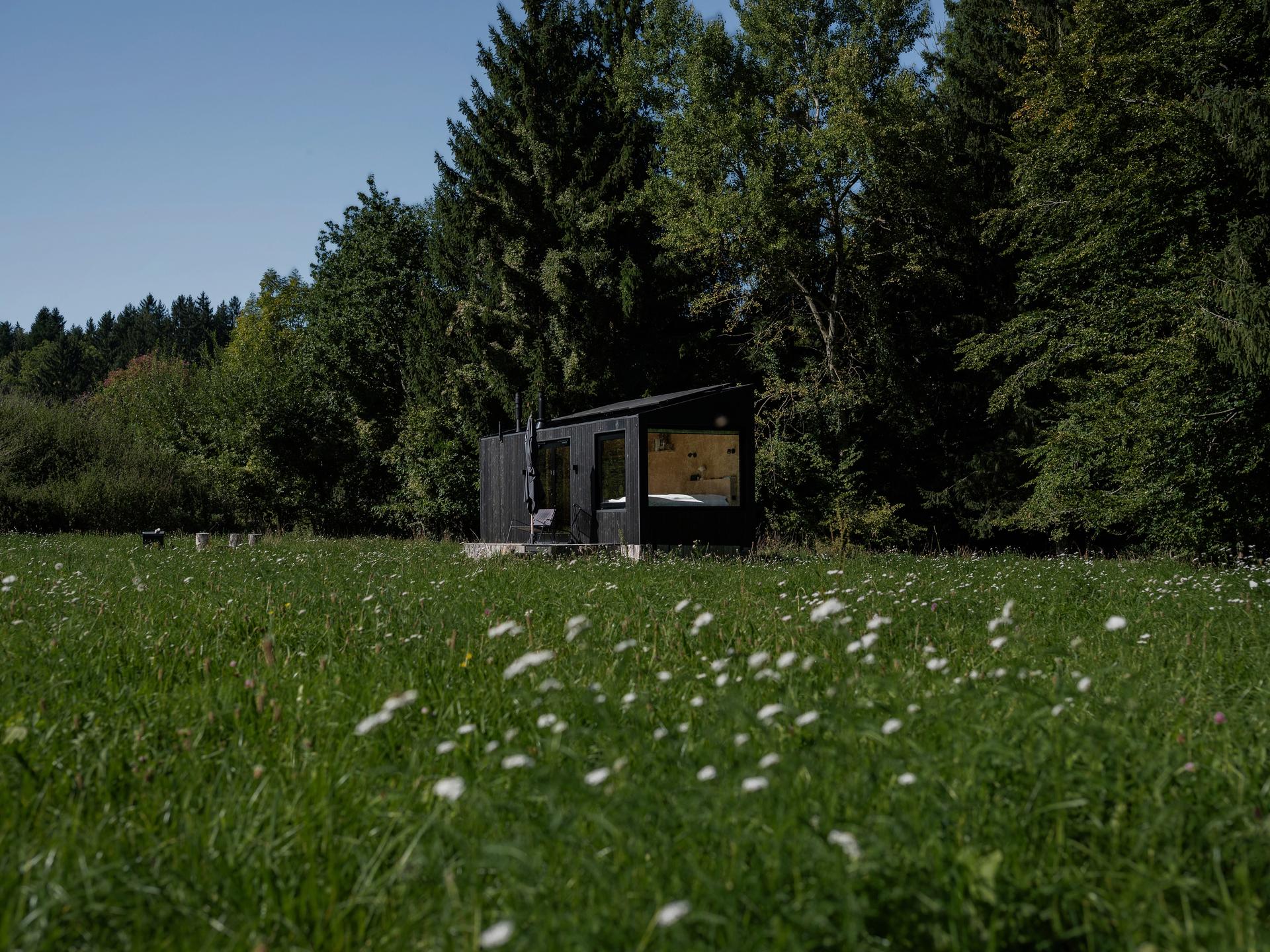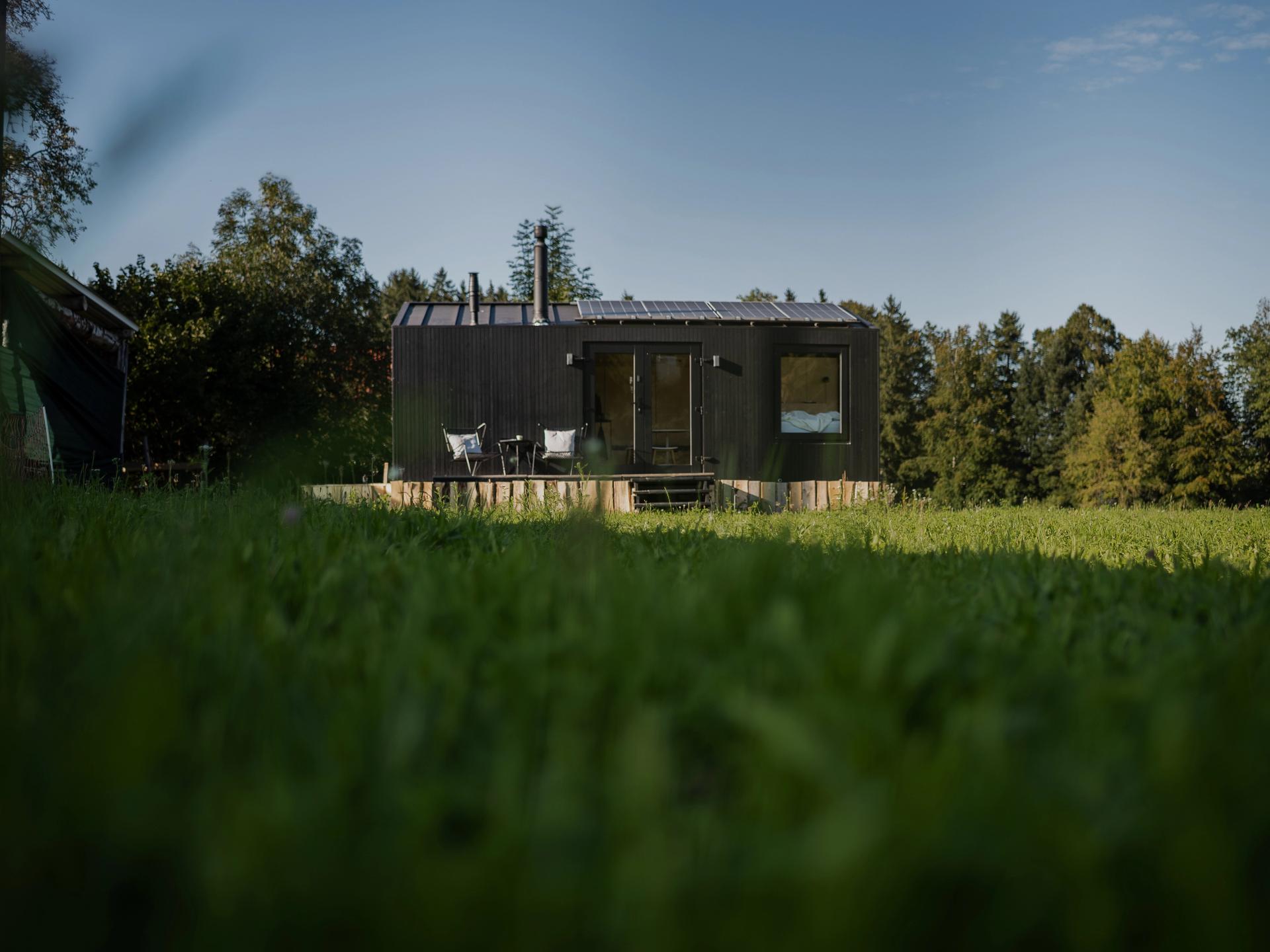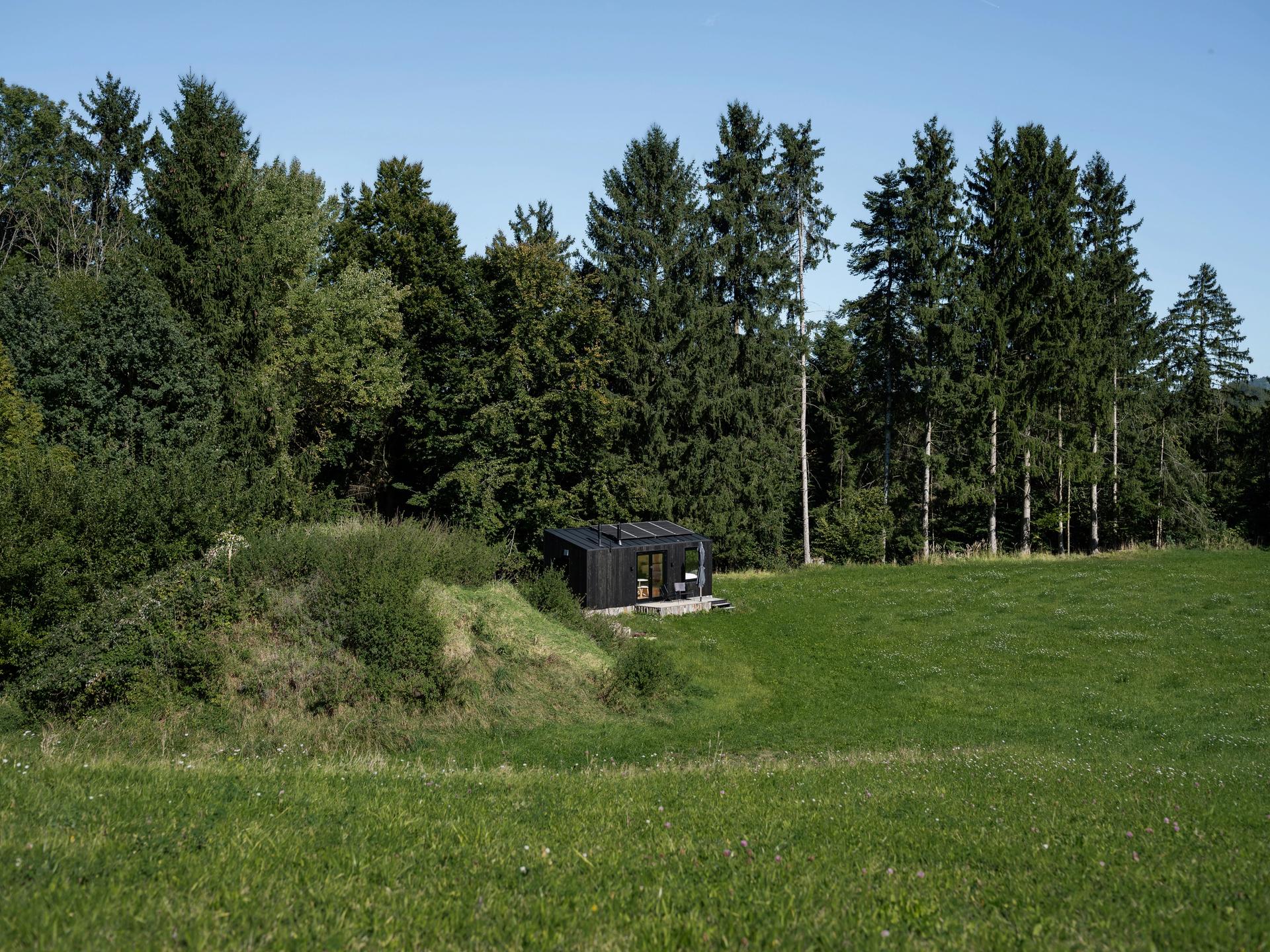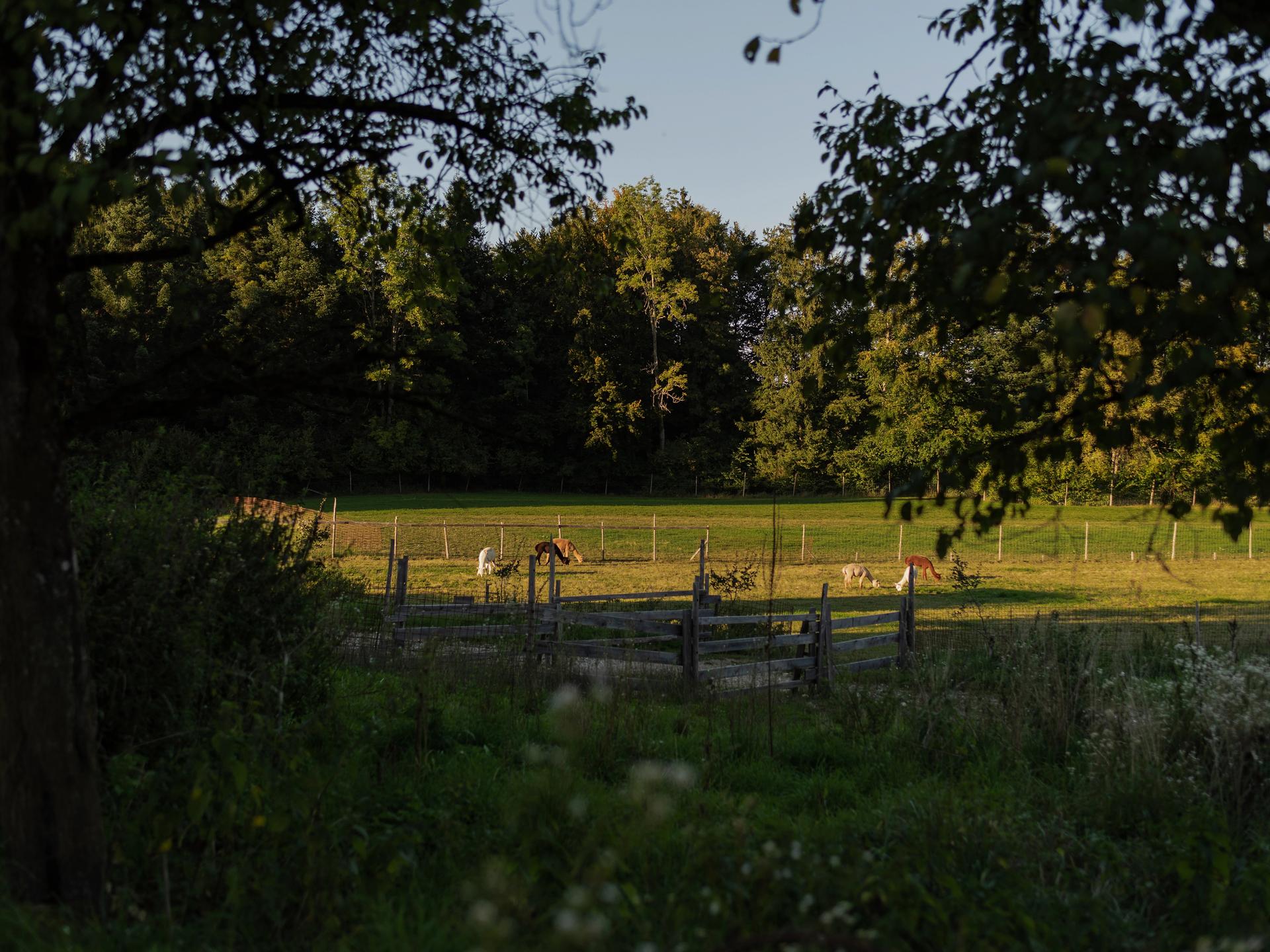 Auf dem Areal eines Bauernhofs mit Alpakas gelegen, umgeben von jungen Obstbäumen und einem dichten Wäldchen.