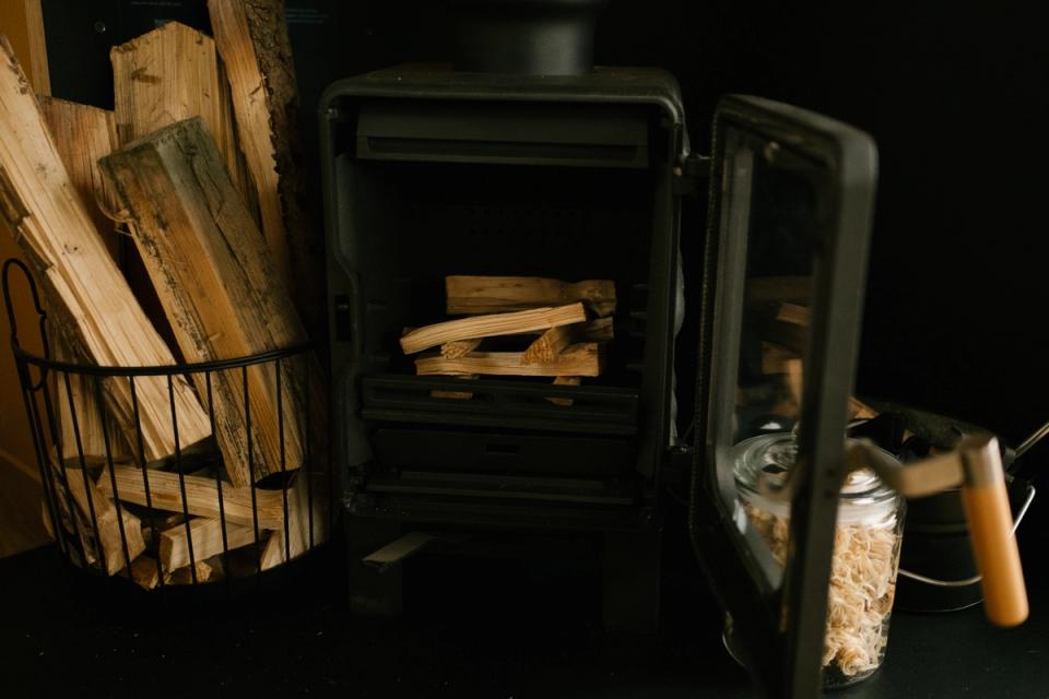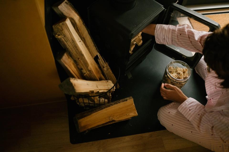 Schichte Kleinholz in den Ofen, entzünde es mit 2–3 Anzündern und lasse die Tür einen Spalt offen.