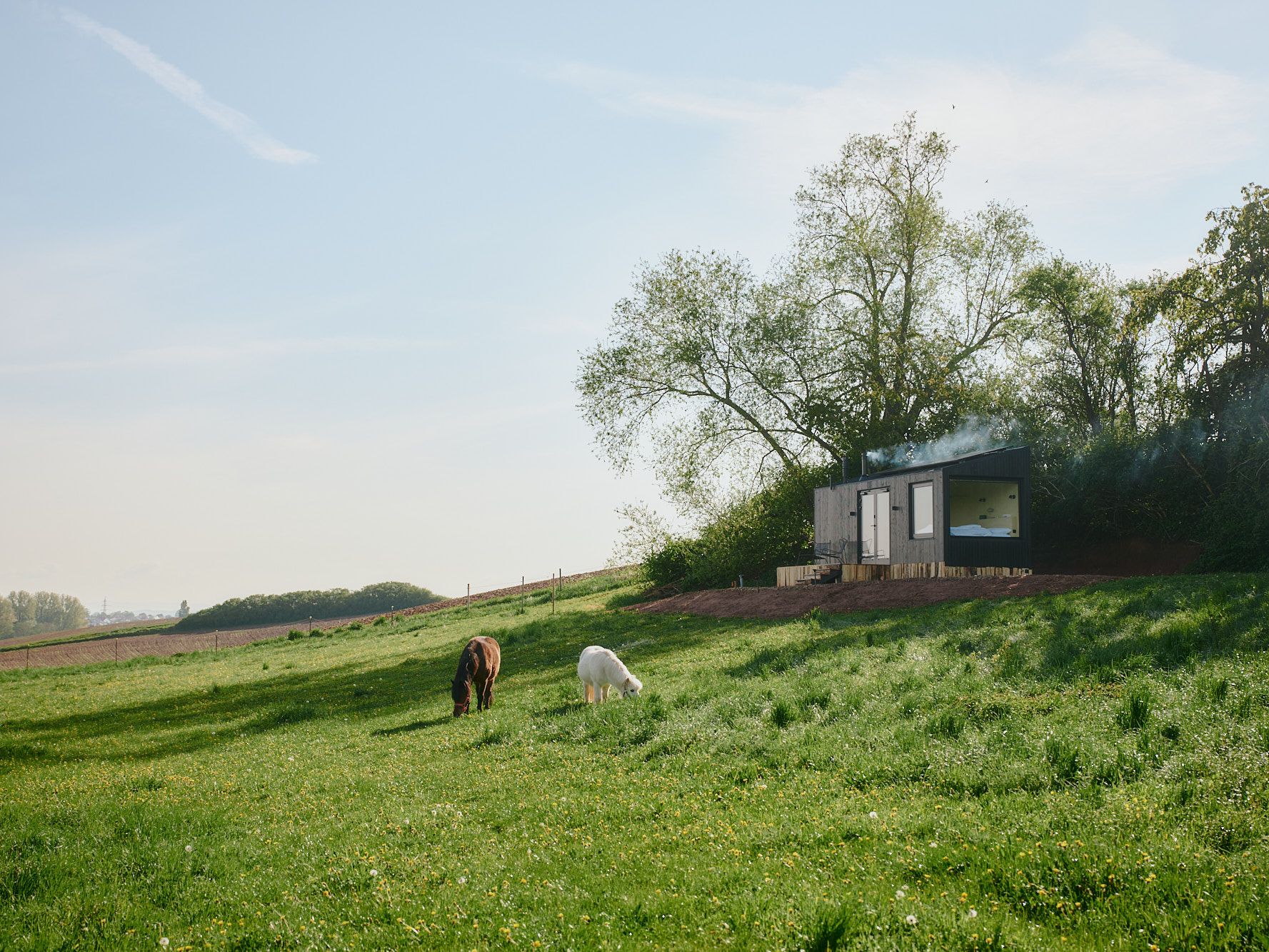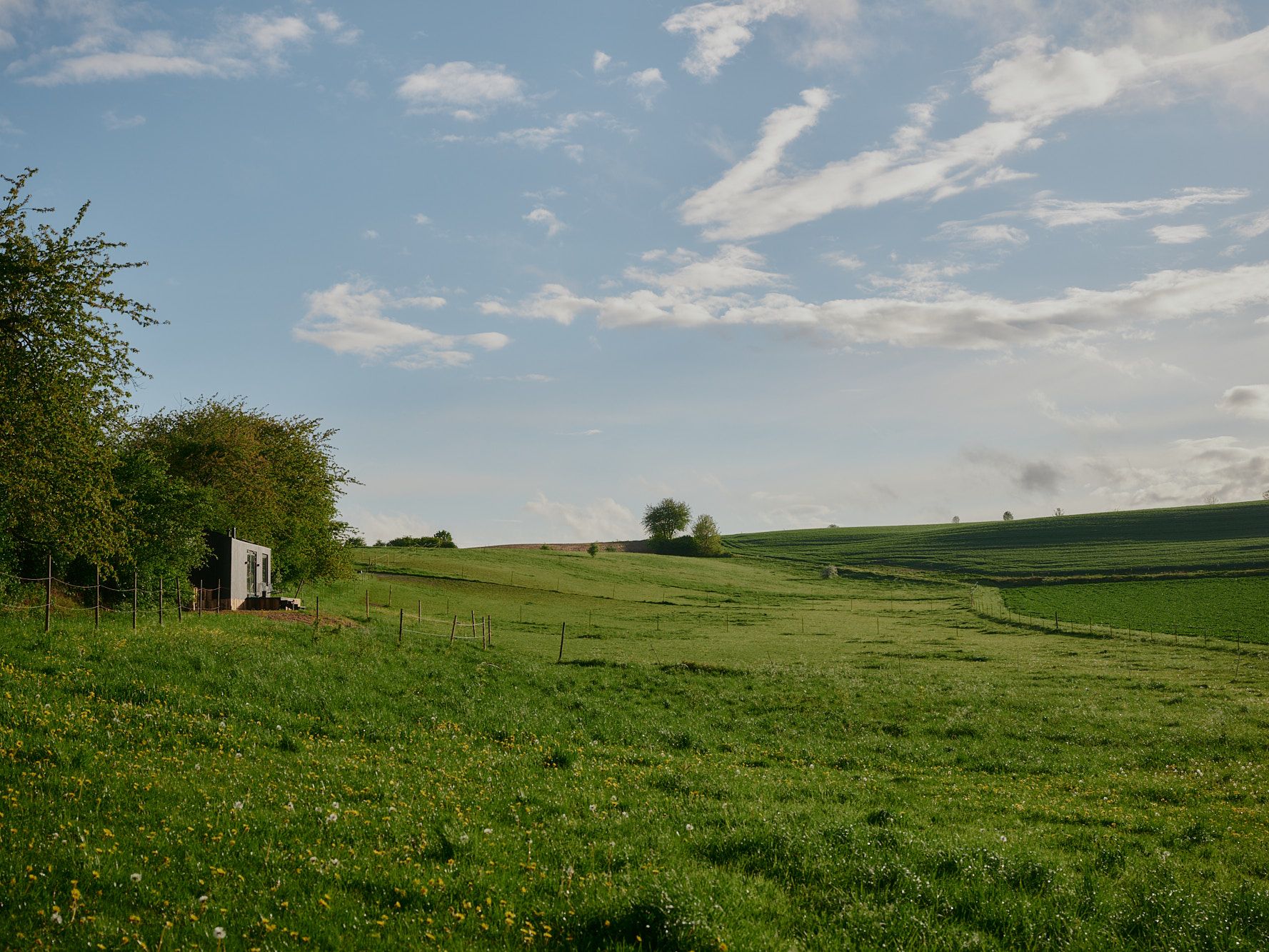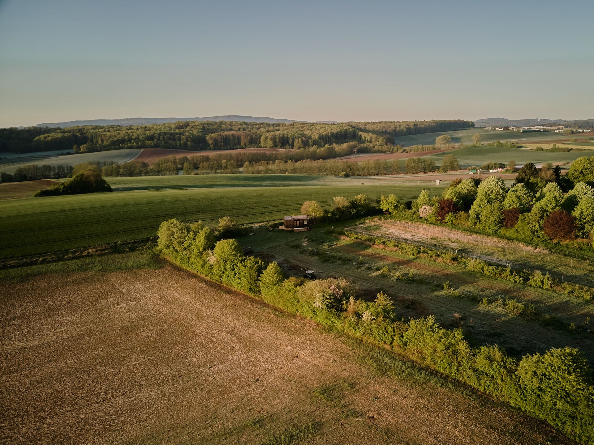 Am Rande eines Hofes und einer Weide gelegen, auf der je nach Jahreszeit Pferde grasen, erstreckt sich dein Blick weit über ein Mosaik aus Feldern hin zur hügeligen Landschaft in der Ferne.