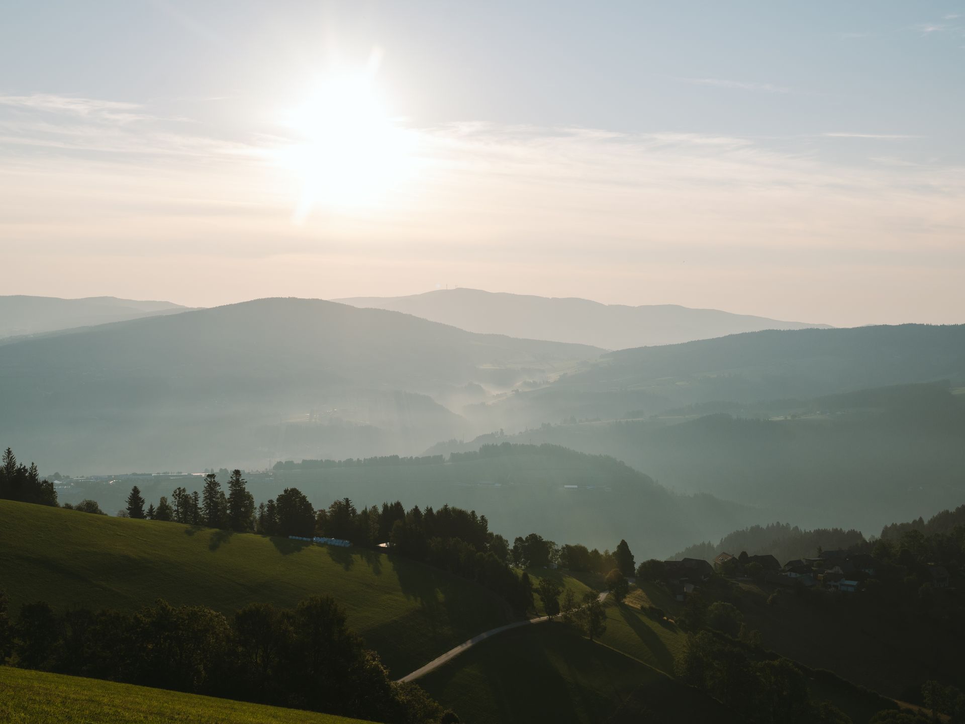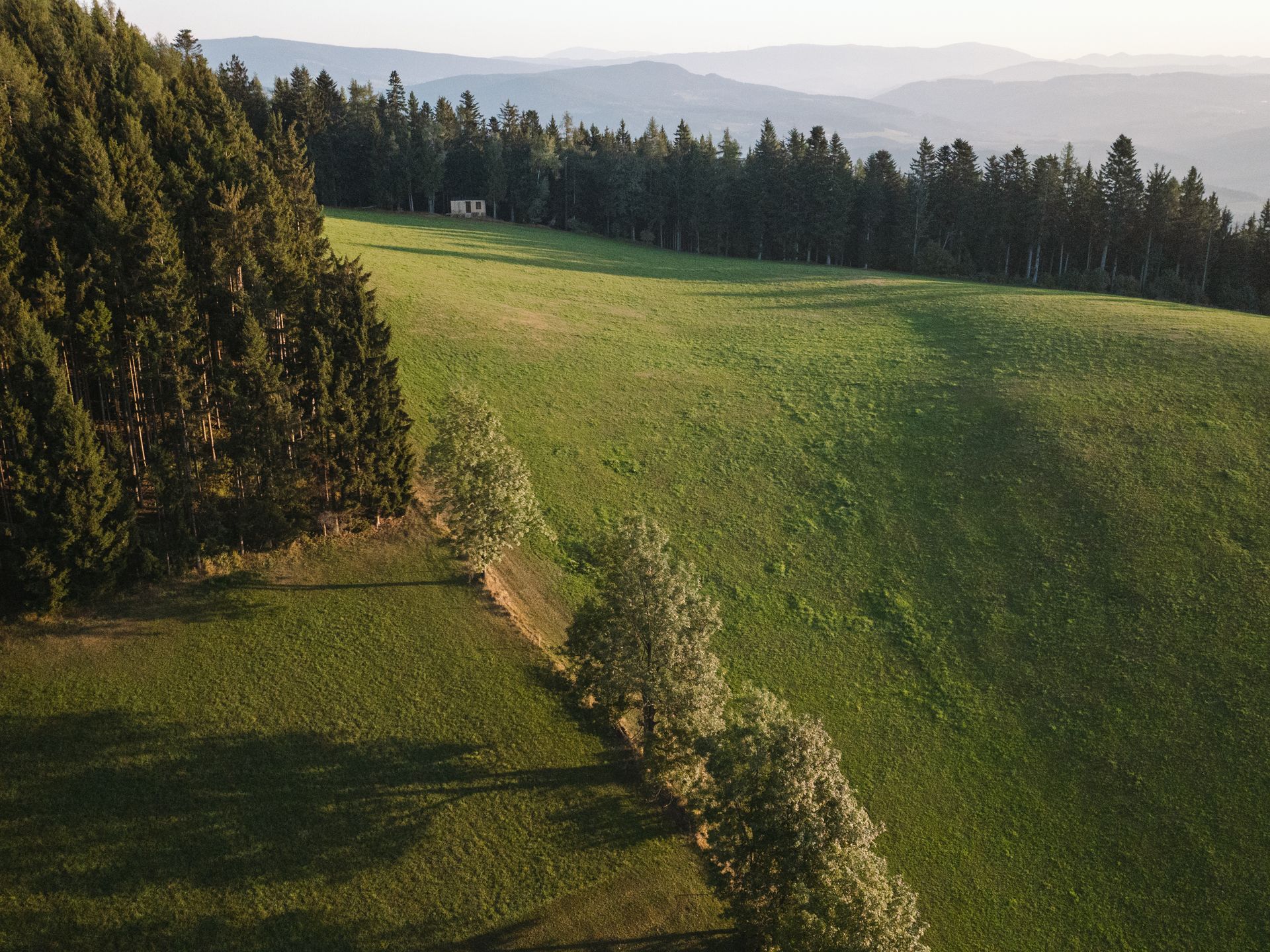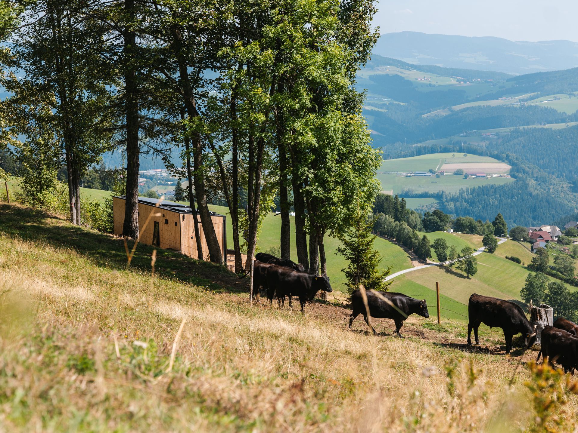 Situated on a large meadow at the edge of a pine forest, with views across the rolling hills of lush alpine pastures.