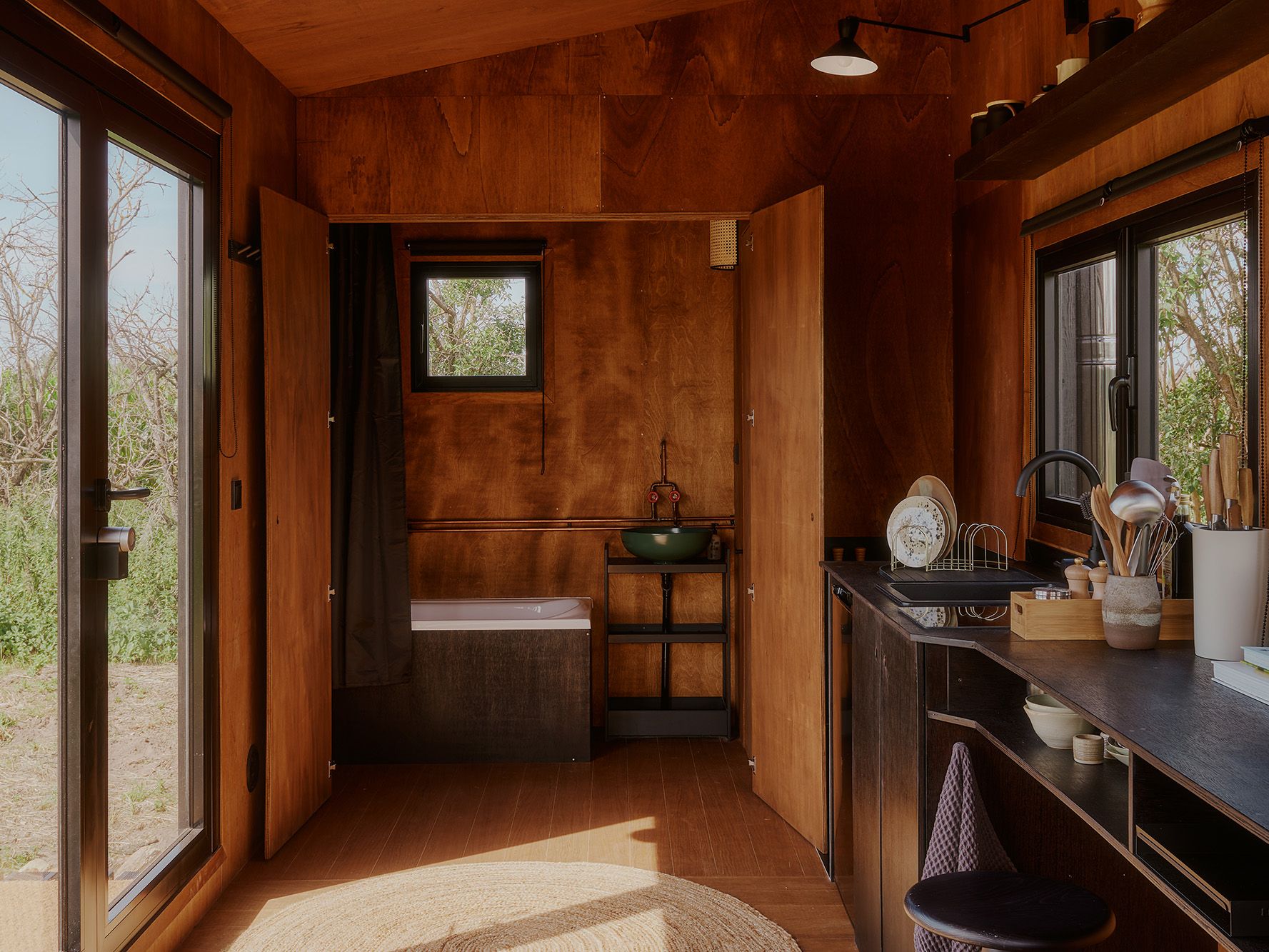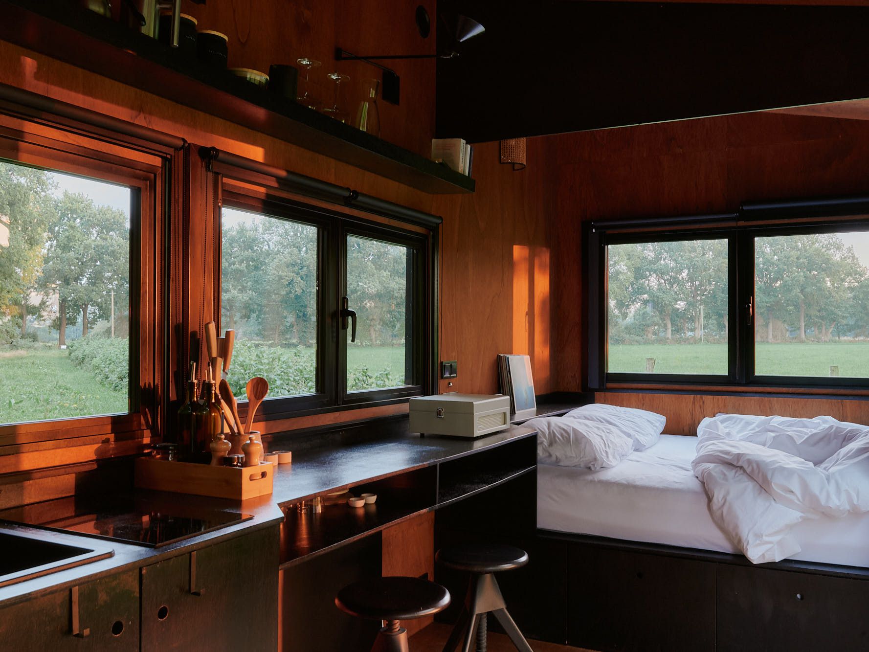 To sink into a good book, you can choose either the bed or the comfortable armchair, and if the sun is shining, enjoy the vast vistas with the front doors wide open. We've also provided a record player that comes with a curated selection of music. We encourage you to sing along.