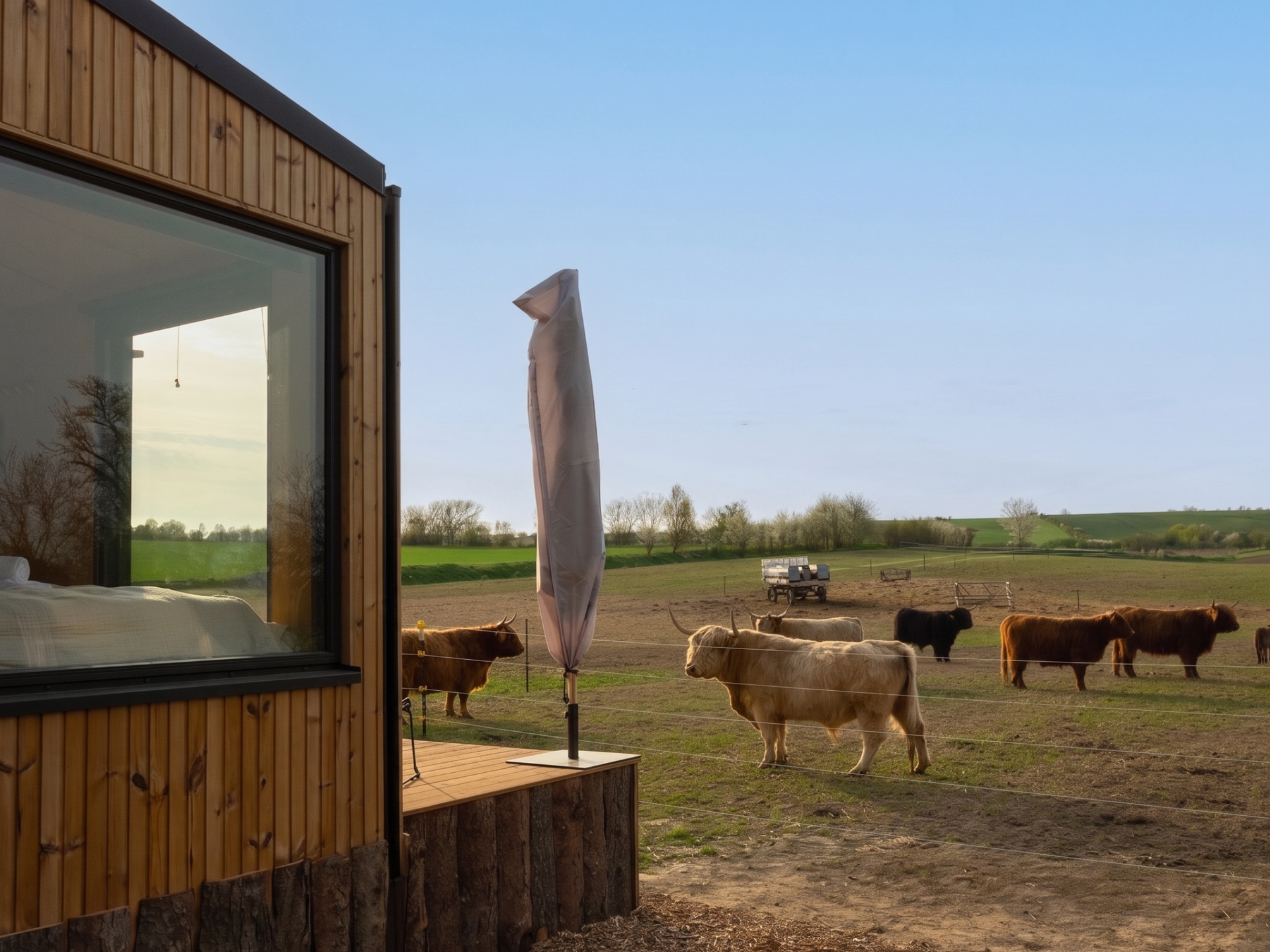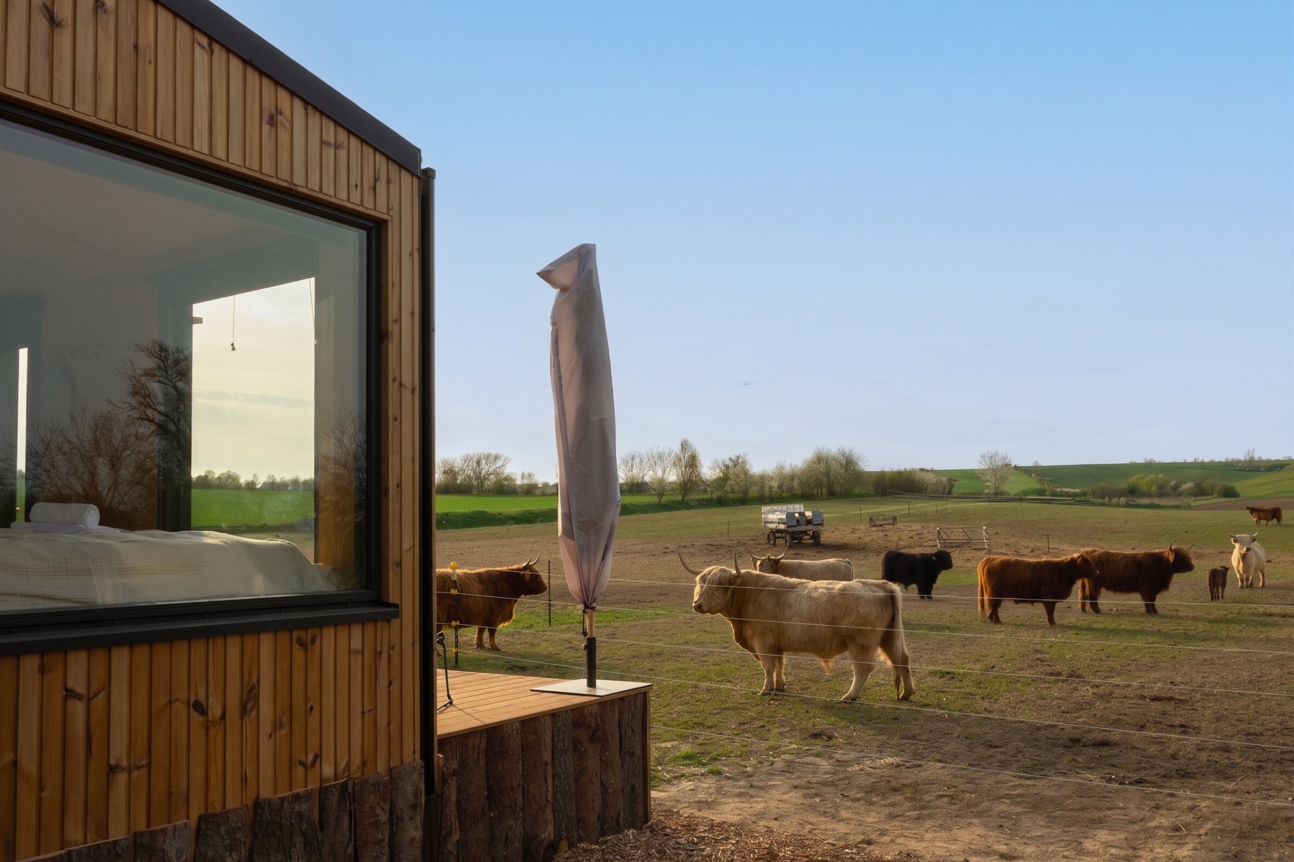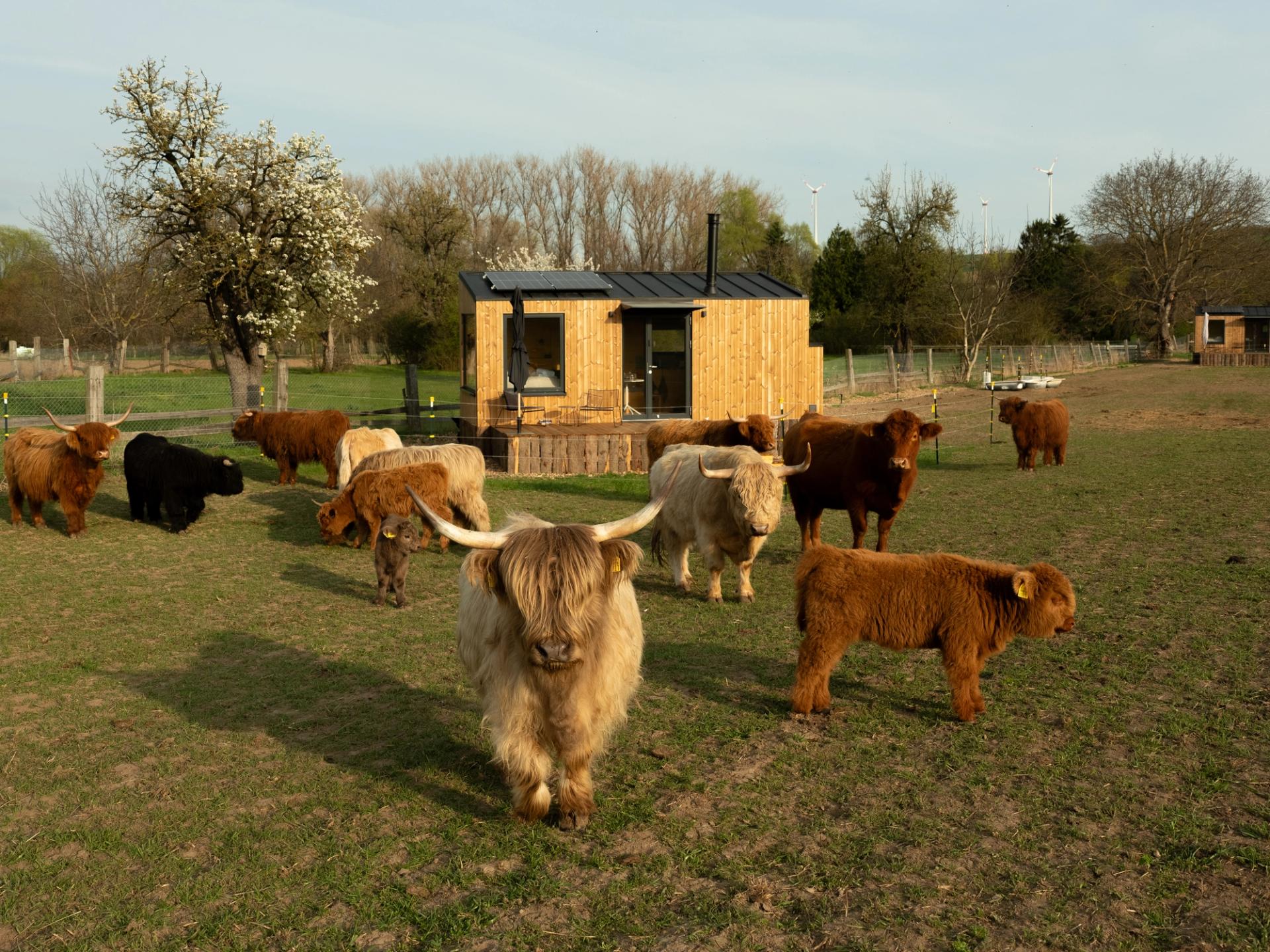 Set in a peaceful rural valley, the two cabins are surrounded by wide open fields and pastures. From your terrace, the landscape unfolds in soft layers of farmland, shifting with the seasons from golden wheat and rapeseed to bright corn and sunflowers. Nearby, Highland cattle move slowly over the fields, while horses graze right next to the Cabins.