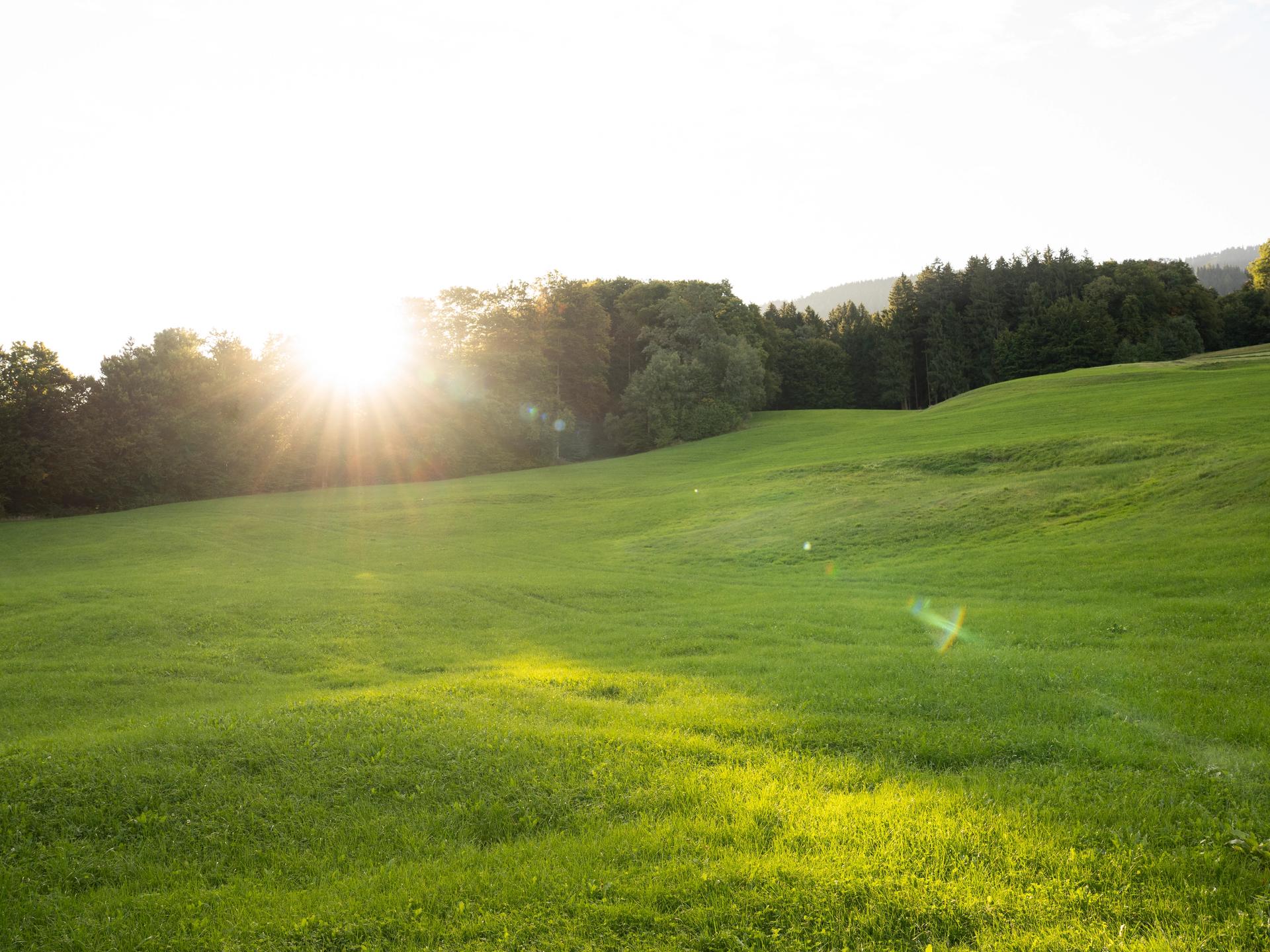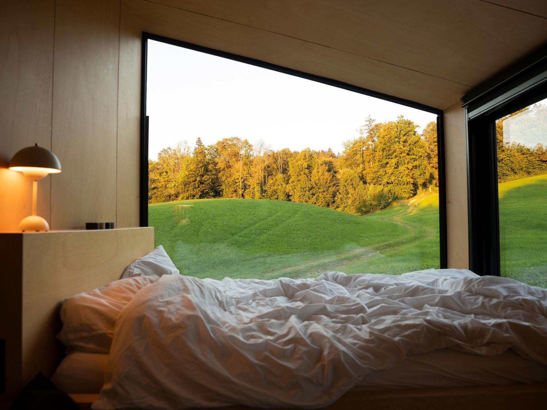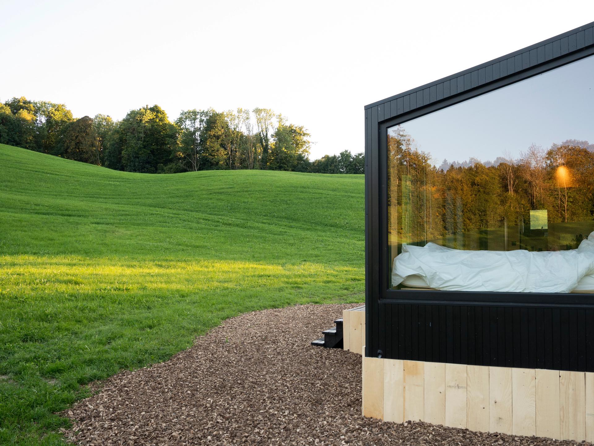 Close to a farm where cows and calves graze, your gaze drifts from the terrace of your cabin across a bubbling spring and gently rolling meadows, stretching all the way to the deep green forest.