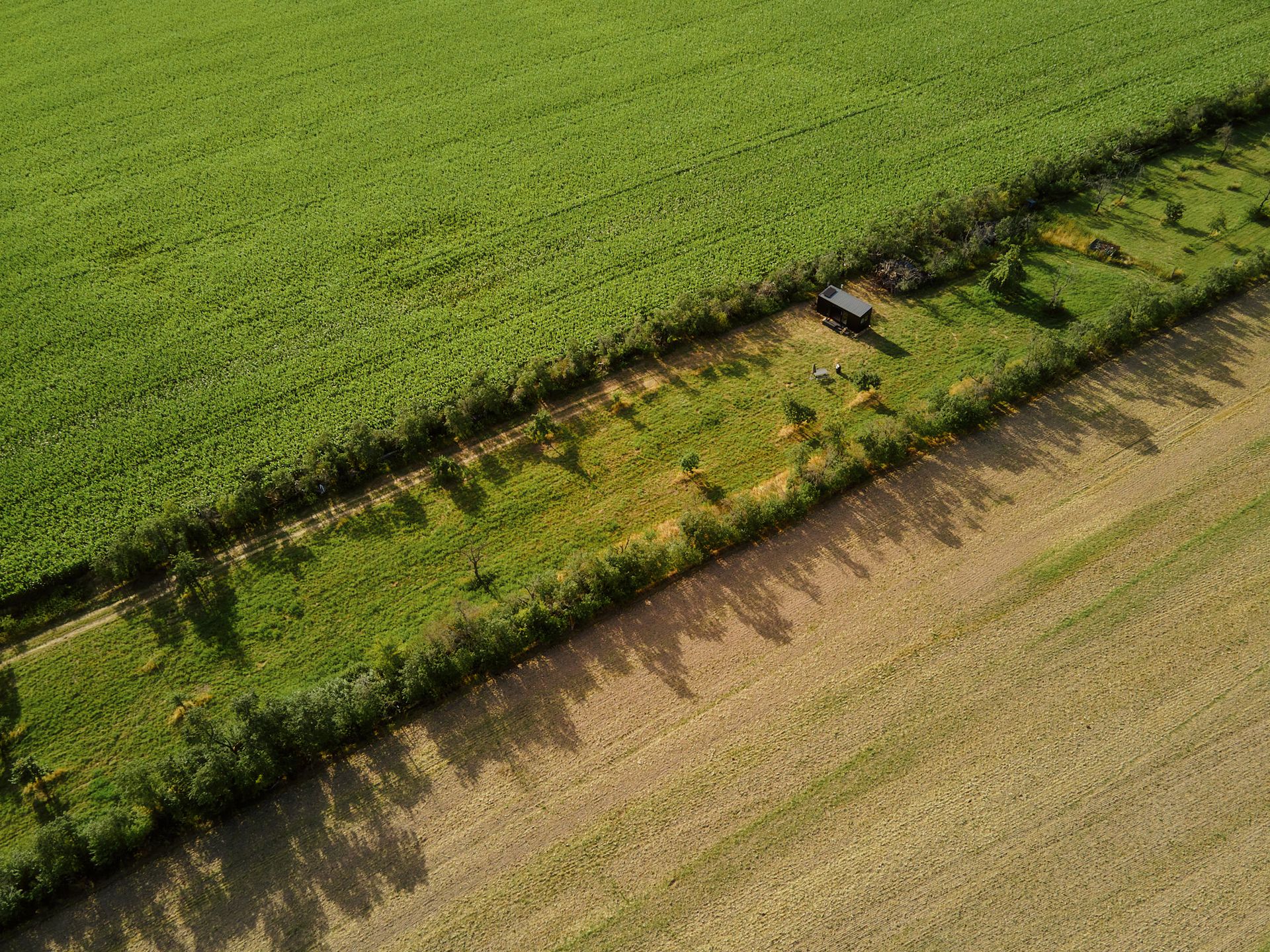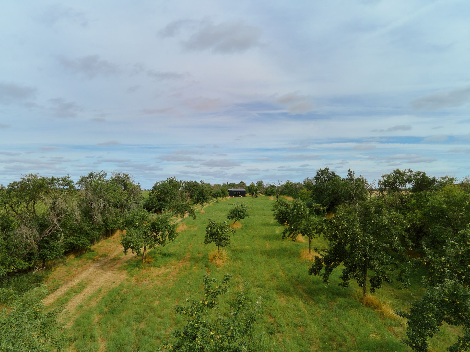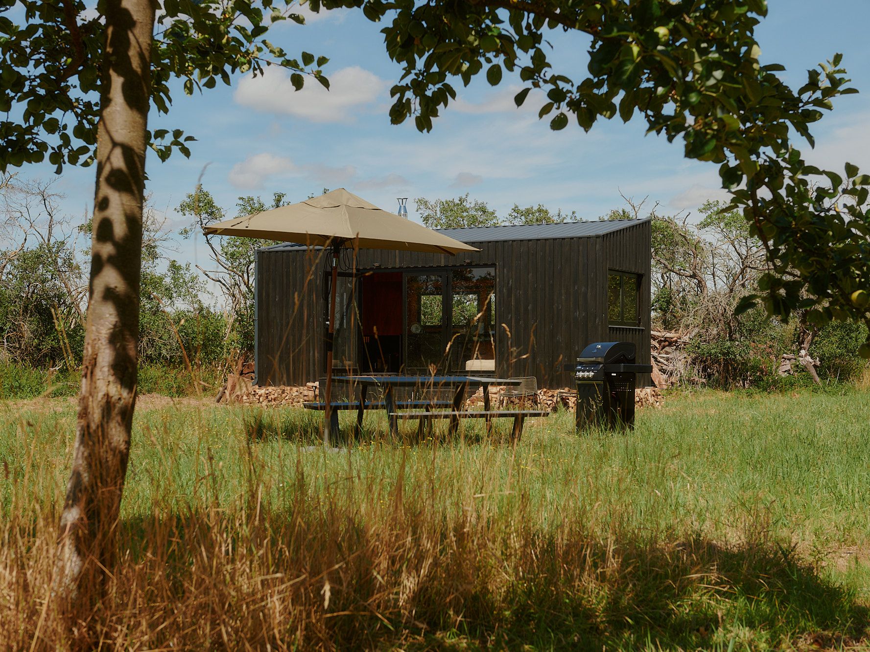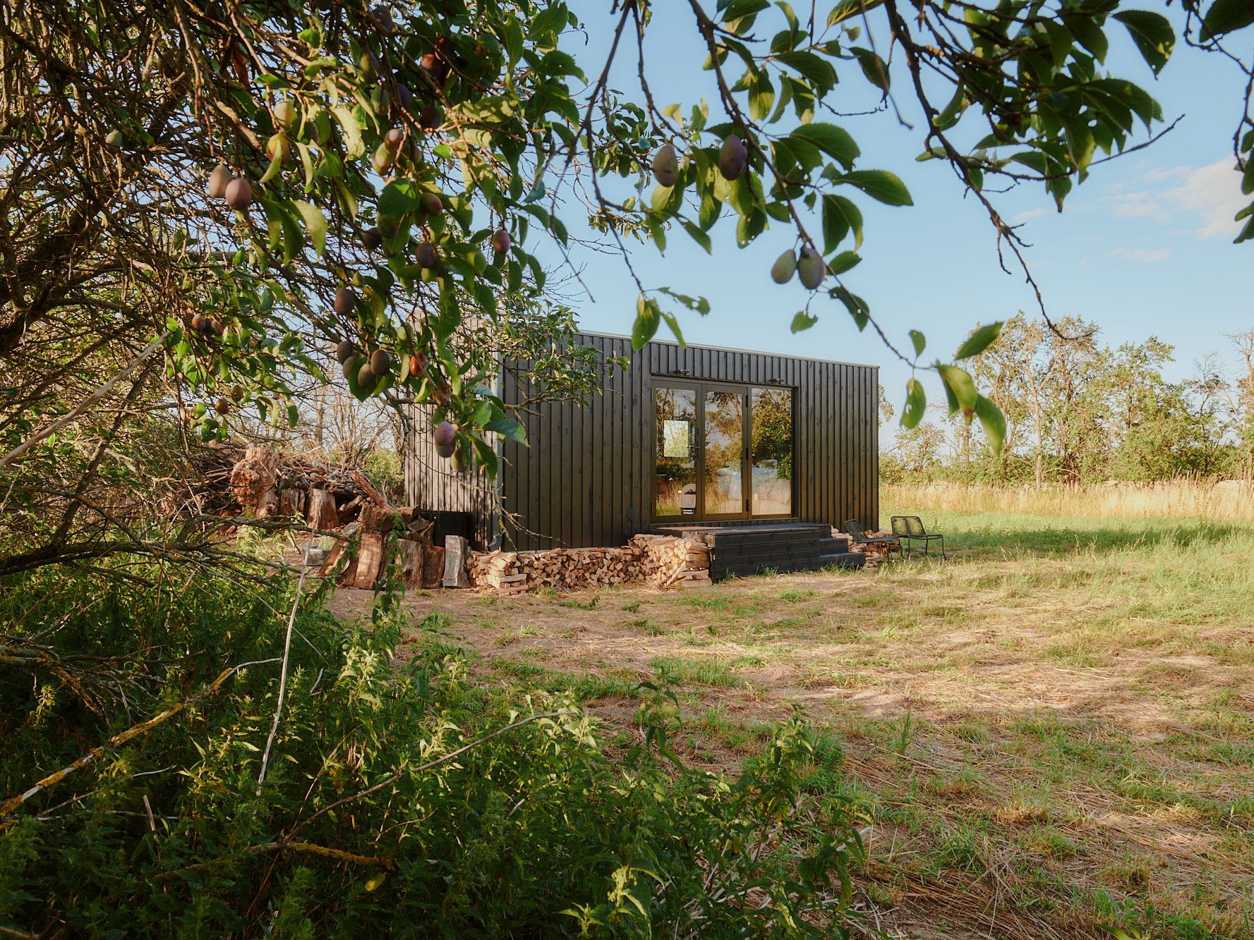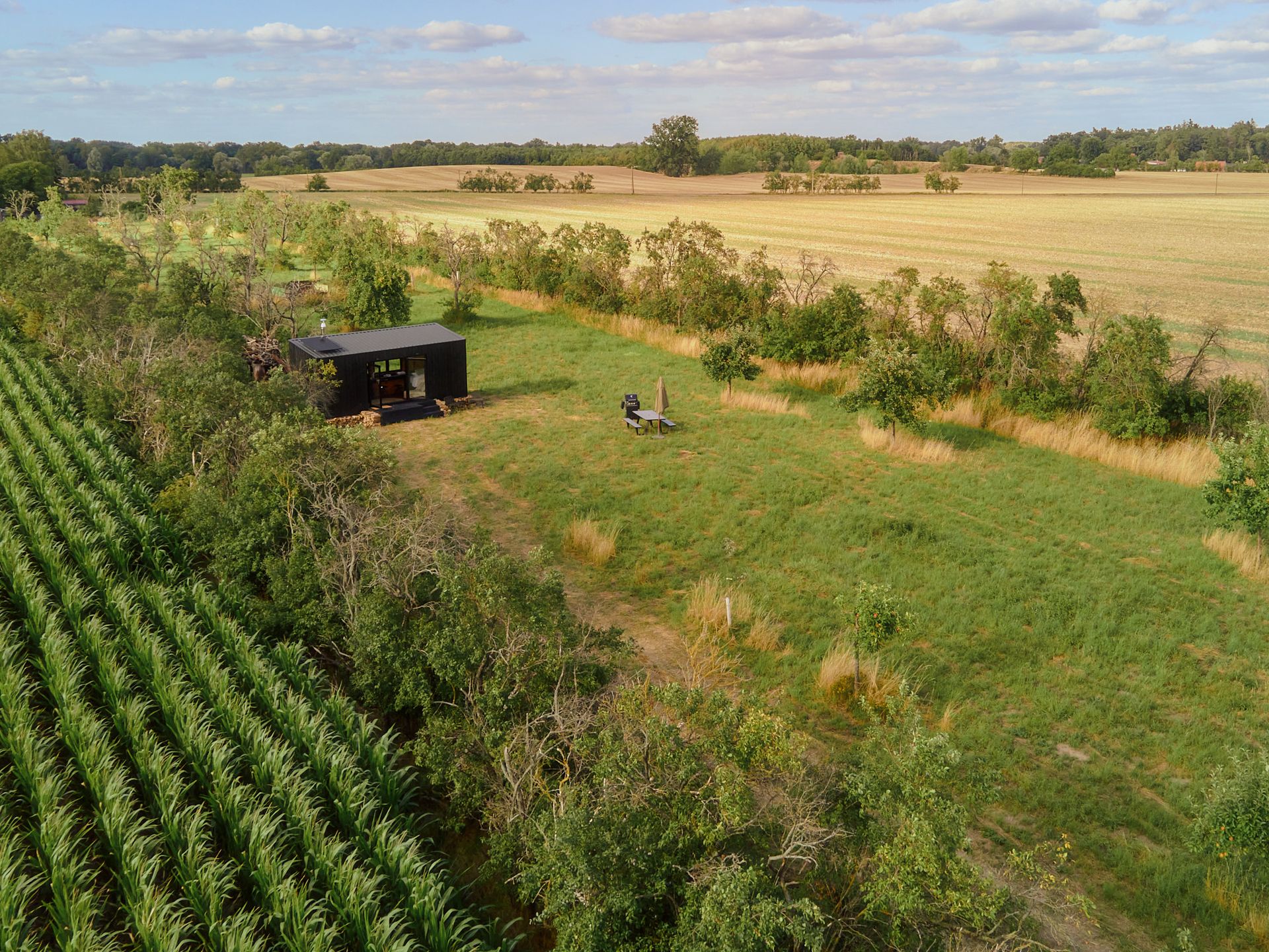 Fringed by dense shrubs, the meadow blends into the landscape along its entire length between two fields. Your cabin is located in the middle of numerous fruit tree rows, which you can spot not only from the terrace, but also through one of the many windows. Watch the deer scampering across the grass at dawn, take a walk to the small post mill at the other end of the meadow, or go for a trip to the nice café located at the castle park nearby.