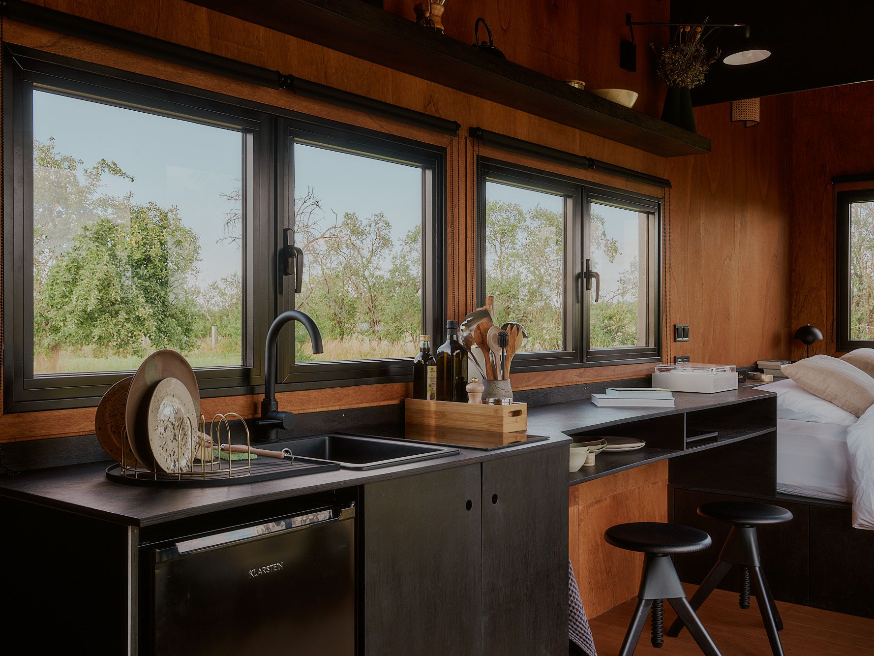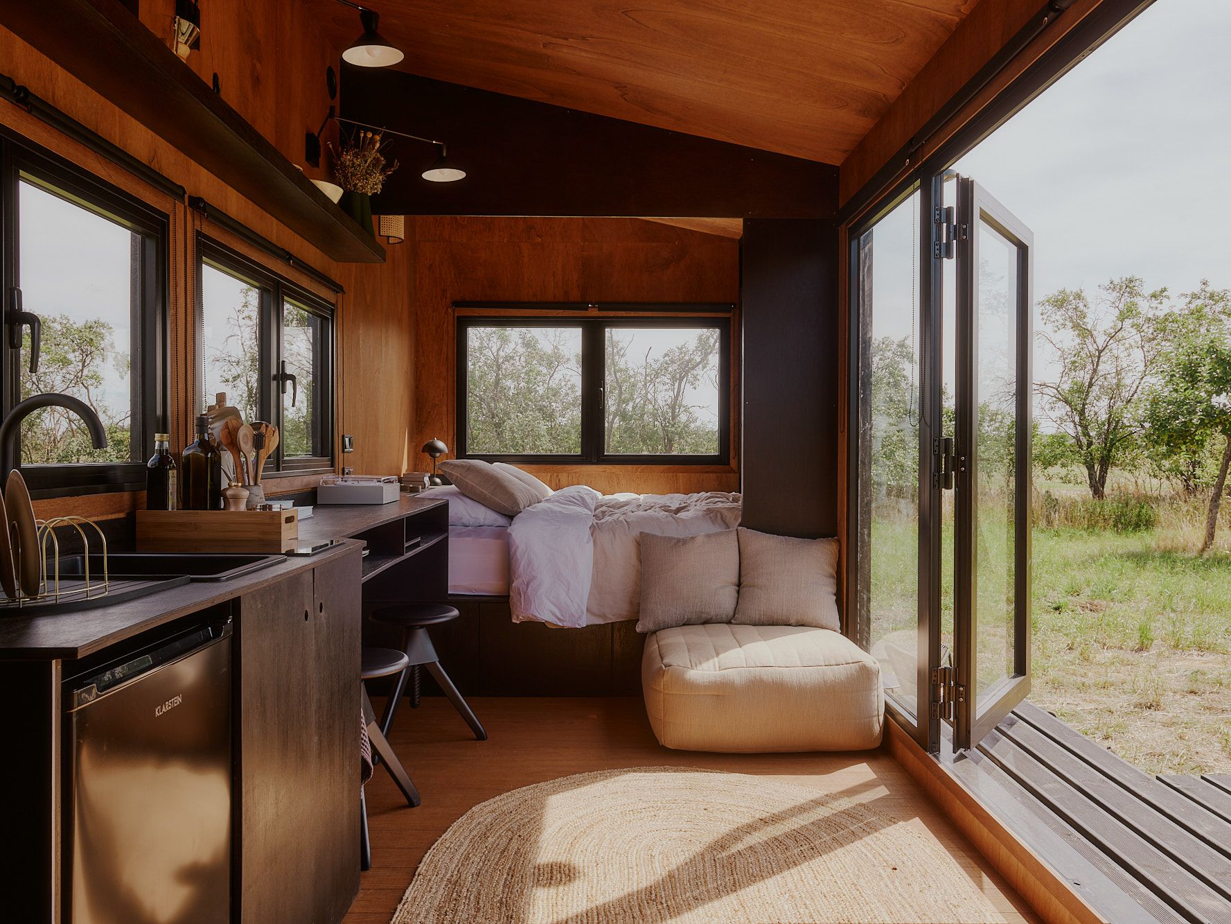 To sink into a good book, you can choose either the bed or the comfortable armchair, and if the sun is shining, enjoy the vast vistas with the front doors wide open. We've also provided a record player that comes with a curated selection of music. We're sure you will find the perfect soundtrack for a summer barbecue afternoon, just as you would for a rainy autumn morning. We encourage you to sing along.